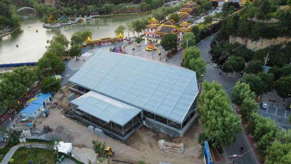 靈通篷房采用坡屋面鋁合金篷房結(jié)構(gòu)形式搭建了40*55*3.3異形主體篷房和10*25*3.3入口門廊,對考古現(xiàn)場進行覆蓋保護。建筑形式為裝配式人字頂篷房,由若干鋁合金管材和鋼結(jié)構(gòu)節(jié)點板拼接成骨架,外面罩以膜材形成。